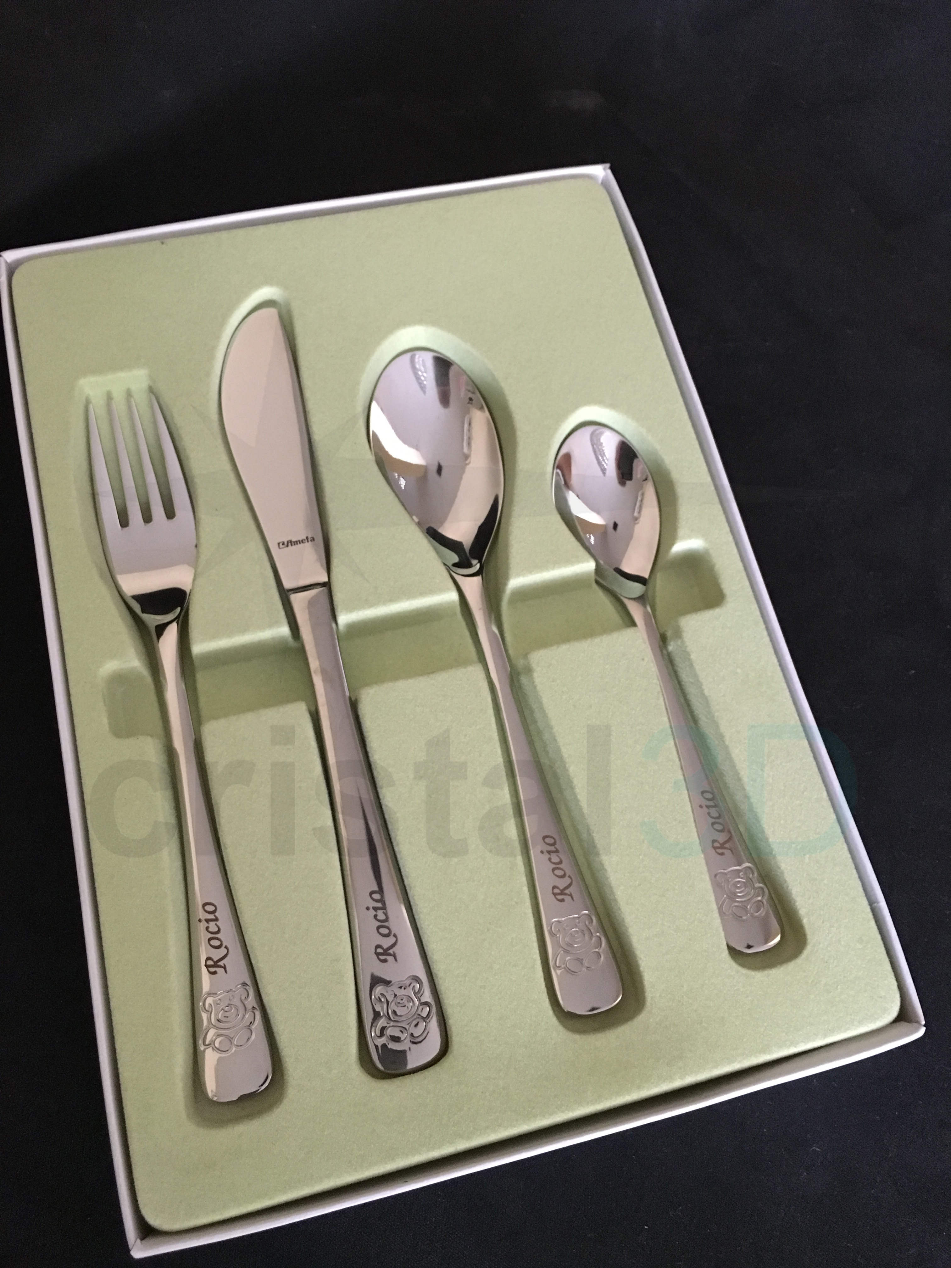 img_9951 29 noviembre, 2016Máxima resolución (3024 × 4032) ← Anterior Siguiente → El detalle perfecto para un bautizo, una comunión o un cumpleaños. Cubertería infantil, set de 4 piezas, compuesto por tenedor, cuchillo, cuchara y cuchara de postre, de la casa #Amefa y distribuido por #Arcoroc, con personalización.